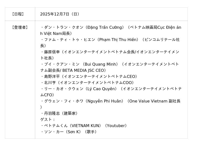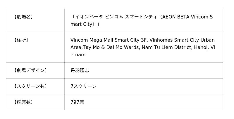 全国に「イオンシネマ」98劇場を運営するイオンエンターテイメント株式会社(本社:東京都港区、代表取締役社長 藤原信幸)は、ベトナム進出1号店「イオンベータ ビンコム スマートシティ( AEON BETA Vincom Smart City)」を2025年12月7日(日)、首都ハノイの大型商業施設「ビンコム メガモールスマートシティ」内に正式オープンいたしました。