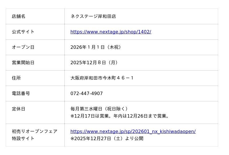 ・ネクステージ岸和田店:https://www.nextage.jp/sp/202601_nx_kishiwadaopen/