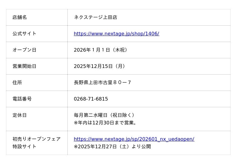 ・ネクステージ上田店:https://www.nextage.jp/sp/202601_nx_uedaopen/