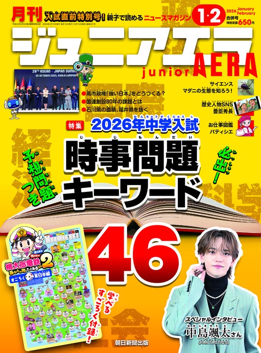 親子で楽しく読めて、中学受験・高校入試の勉強にも役立つ、小・中学生のためのニュース月刊誌ジュニアエラ2026年1・2月合併号が、12月15日(月)に発売されました。今号は「入試直前特別号」!特集は「2026年中学入試 超重要キーワード46+予想問題集」。特別付録として、「特別版・桃鉄&朝小コラボすごろく」がついています。