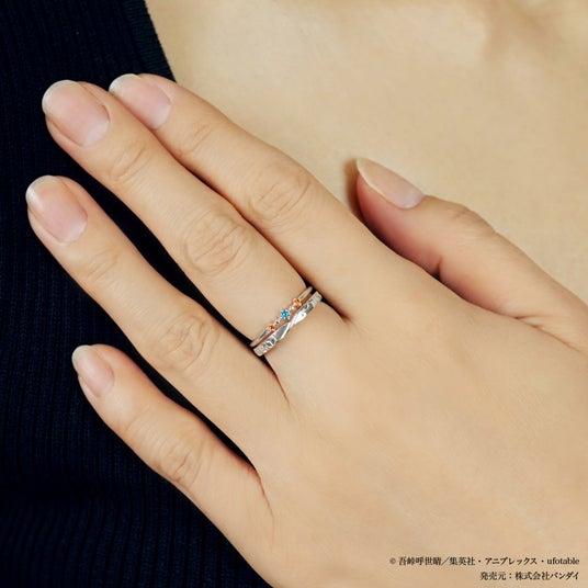 石付きのリングはセンターに義勇をイメージしたブルーのストーンをセッティングし、サイドには錆兎をイメージしたオレンジのストーンを添えています。地金のリングには羽織の文様と、戦いの中で頬に現れる痣を刻印で表現。時を越えて心の中で共に在り続ける二人の固い絆を感じるデザインで、誰でもデイリーに着けやすいジュエリーに仕上げています。