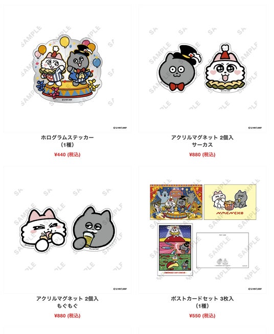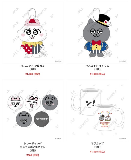 本イベントに向け、サーカスをテーマにしりもと先生が特別に描き下ろした、サーカス衣装を纏った「ンめねこ」「うすくろ」のイラストを使用した特別なグッズをたくさんご用意しております。サーカスをテーマにカラフルでハッピーな空間でンめねこ達の展示を体験し、写真を撮影して友達に自慢しちゃおう♪ファンの皆様にお楽しみいただけるイベントとなっておりますので、ご来店を心よりお待ちしております。