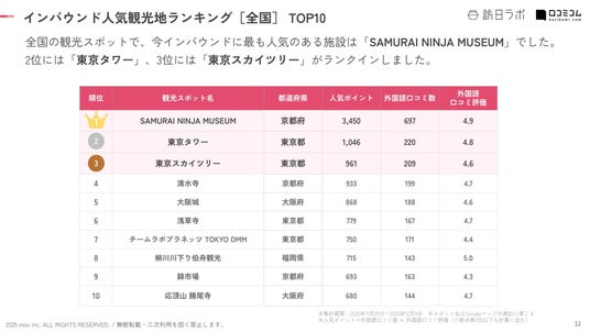 業界最大級のインバウンドビジネスメディア「訪日ラボ」及び 店舗向け集客一元化プラットフォーム「口コミコム」を運営する株式会社mov(代表取締役:渡邊 誠、本社:東京都渋谷区、以下mov)は、全国の観光地に寄せられた最新の口コミデータから、独自の『インバウンド人気観光地ランキング』を発表しました。