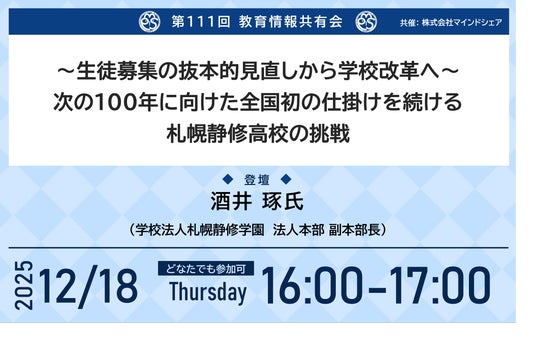 第111回となる今回は「~生徒募集の抜本的見直しから学校改革へ~ 次の100年に向けた全国初の仕掛けを続ける札幌静修高校の挑戦」というテーマで、学校法人札幌静修学園 酒井琢氏(法人本部 副本部長)よりお話しいただきます。