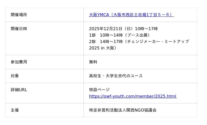 NGO等の活動紹介やワークショップ、U25交流企画や特別プログラムを通じて、国際課題への学びとユース同士の交流を深めるイベントを2025年12月21日(日)、大阪市西区の会場で開催します。