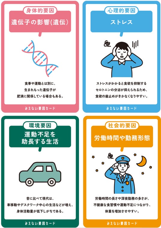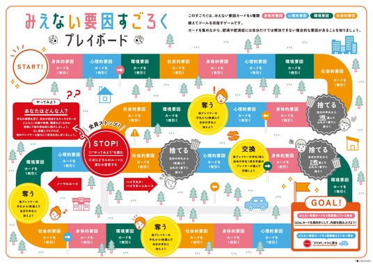すごろくを進めながら、「みえない要因カード」を4種類(身体的要因、心理的要因、環境要因、社会的要因)揃えてゴールを目指すボードゲームです。カードを集めながら、肥満や肥満症には自分だけでは解決できない複合的な要因があることを理解できる仕組みになっています。