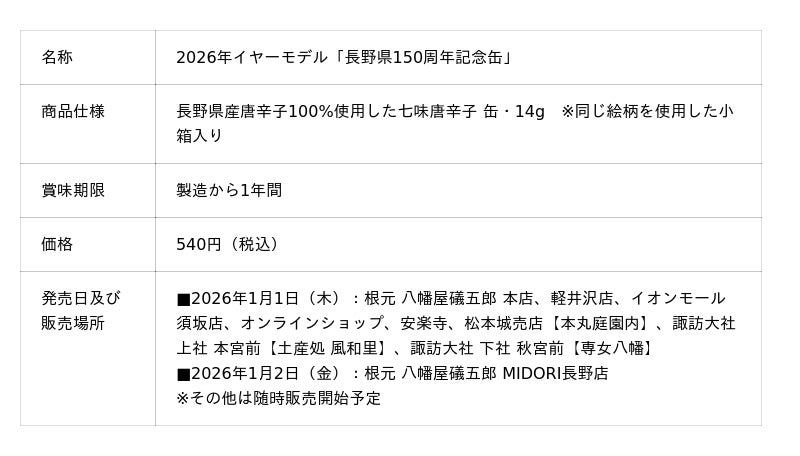 株式会社 八幡屋礒五郎(本社:長野県 代表取締役:九代目 室賀栄助)は、長野県150周年を記念し、2026年1月1日(木)より2026年イヤーモデル《長野県150周年記念缶》を発売いたします。