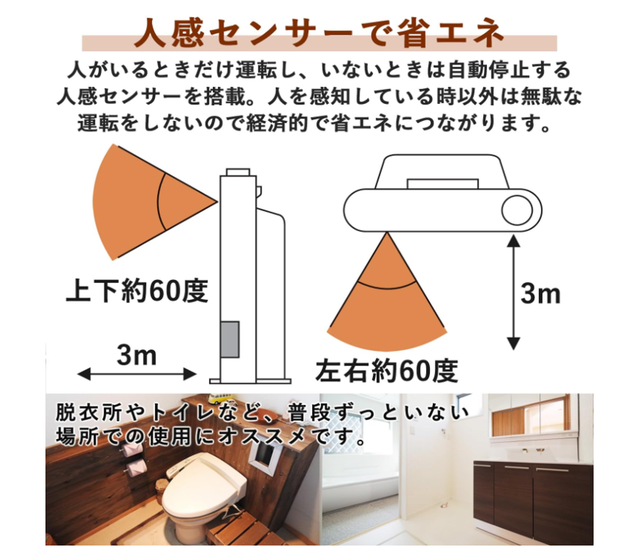 人を検知すると自動で運転を開始し、一定時間動きがないと自動で停止する人感センサーを搭載しているので、無駄な運転をなくし省エネにも役立ちます。つけっぱなし防止・電気代の節約・操作の手間軽減と、実用性の高い嬉しい機能ですよ。