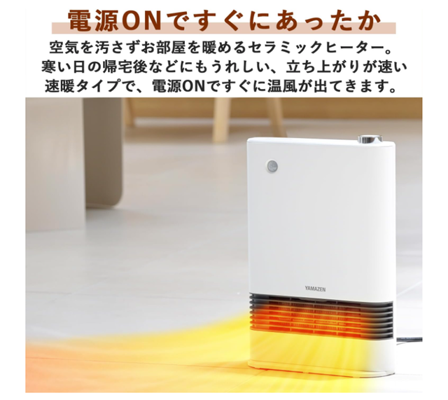 スイッチONで2秒の速暖&人感センサー搭載で省エネも! 山善のセラミックファンヒーターが30%オフ