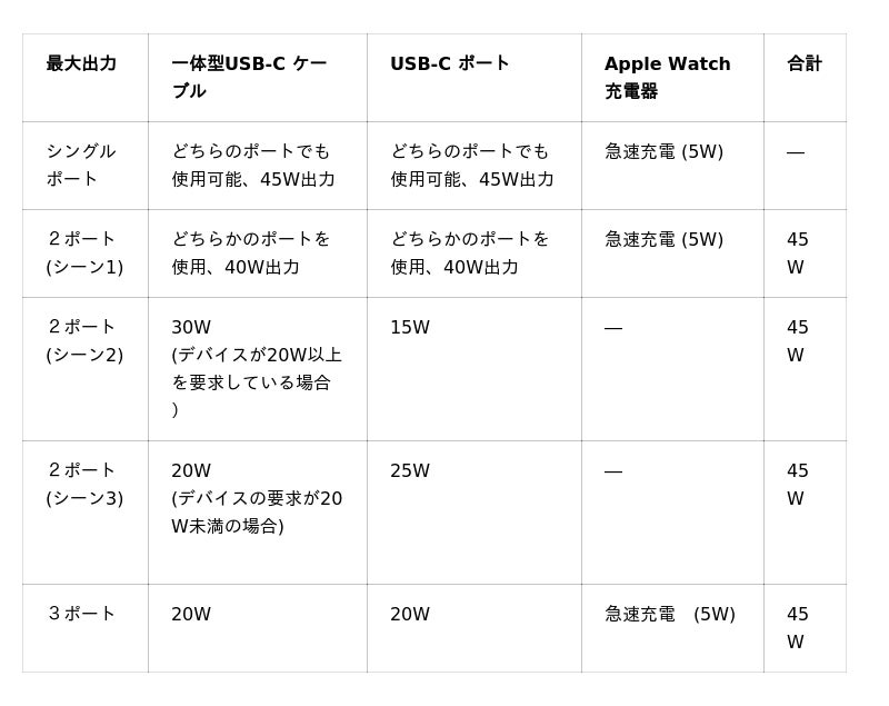 45Wの高出力により、MacBook AirなどのPCにも充電可能。Apple WatchやiPhone、イヤホンなど、最大3台のデバイスをシーンに応じてまとめて充電できます。