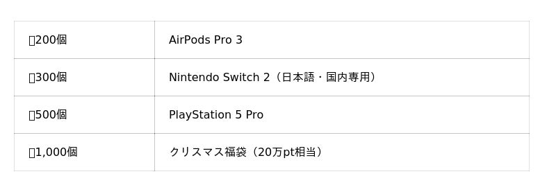 集めた個数に応じて、話題のゲーム機や高額カードなどの景品と交換できます。