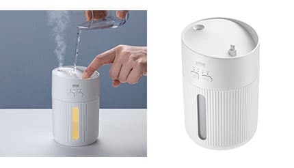 超音波式なのでミストは熱くならず、子どもやペットがいる家庭でも安心して使用可能で、動作音は静かなため就寝中や集中したい作業の際にも気にならない。さらに、本体側面には水の残量を確認できる窓を備えるとともに、窓の部分からLEDを点灯させられるので、ナイトライトとしても活躍する。