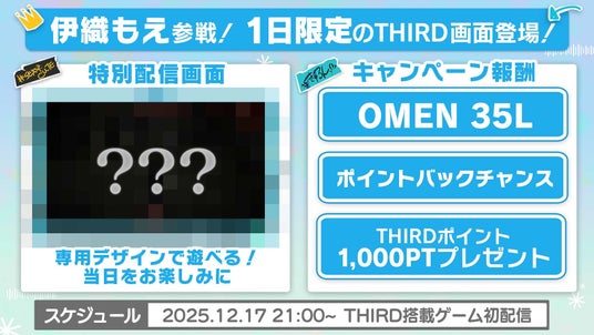 本配信ではTHIRD内で「伊織もえ専用UI」を通じ、かつてない没入感のあるゲーム実況をお届けします。