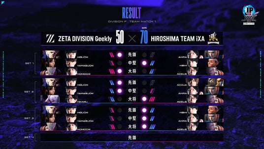 「ZETA DIVISION Geekly」は、1巡目、2巡目先鋒戦・中堅戦と順調に価値を重ねていき、「広島 TEAM iXA」を絶体絶命の状況まで追い込む。