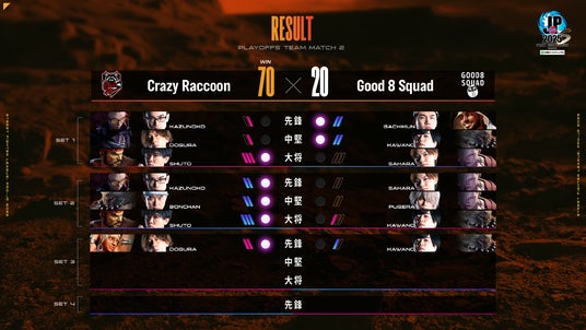 1巡目序盤、「Good 8 Squad」は先鋒戦、中堅戦と立て続けに勝利しリードする。しかし、続く大将戦では「Shuto選手」が「さはら選手」に3-0のストレート勝利を見せると「Crazy Raccoon」が勢いづいていく。