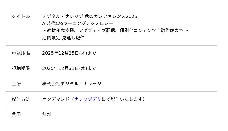 年末のご多忙な時期でございますので、弊社が提供するクラウド型学習支援サービス「ナレッジデリ」にて、ご都合の良い時間に視聴可能なオンデマンド形式で配信いたします。