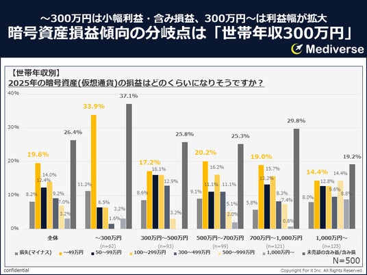 暗号資産口座保有者500名に対して、今年の損益予想を聞いたところ、未売却の含み損益(26.4%)を除くと、もっとも多かったのは「~49万円」(19.6%)となっており、「100~299万円」(14.9%)、「50~99万円」(12.4%)が続いた。