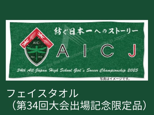 第34回の冬の全国選手権出場を記念して、チームのエンブレムとロゴとチームのテーマである「紡ぐ日本一へのストーリー」をあしらったフェイスタオルを準備しました。日々の生活の中でAICJ女子サッカーを応援してください!
