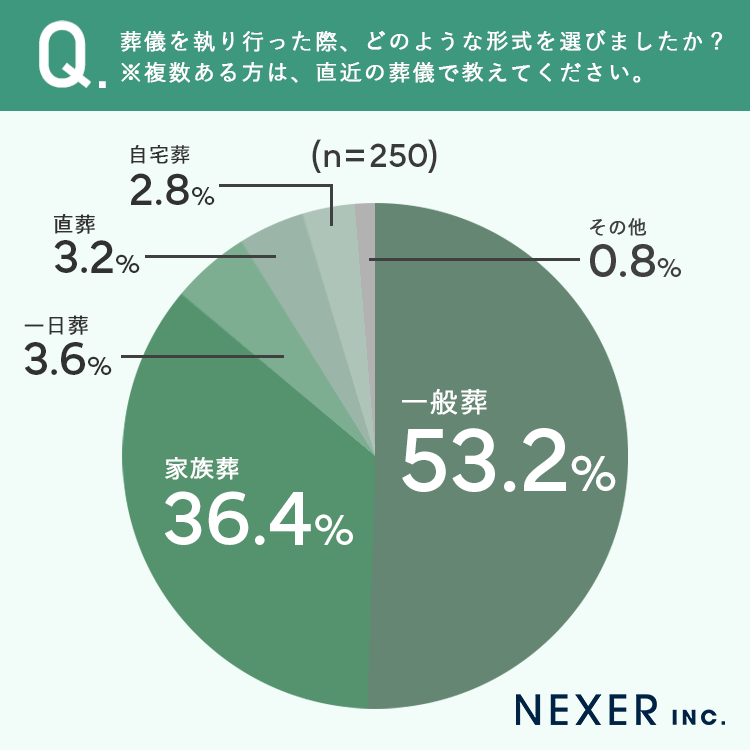「一般葬」を選んだ方が53.2%と最も多く、続いて「家族葬」が36.4%という結果になりました。