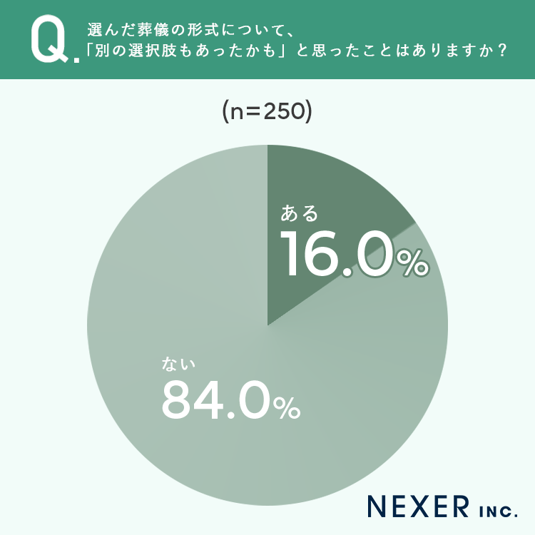 一方で、16.0%の方が「別の選択肢があったかもしれない」と回答しており、葬儀後に費用・規模・参列者の状況などから振り返るケースも少なくありません。