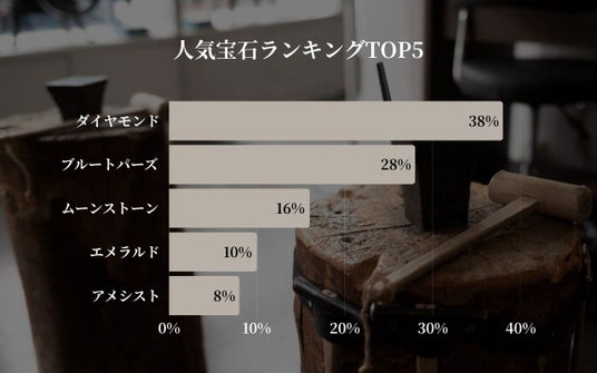 選ばれた宝石の第1位は「ダイヤモンド」(38%)でしたが、色石が全体の62%を占め、「ブルートパーズ」(28%)、「ムーンストーン」(16%)が上位にランクインしました。