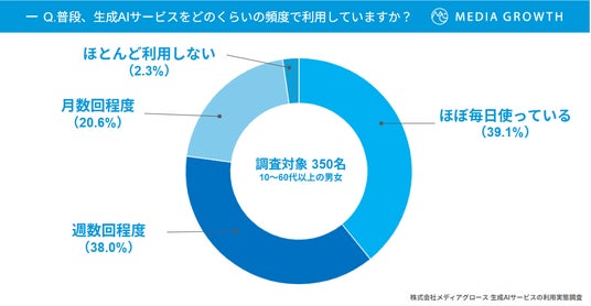 SEO・LLMO対策支援、メディア運営などを行う株式会社メディアグロース(東京都新宿区、代表取締役:舟崎友貴)は、全国の10代~60代の男女350名を対象に「生成AIツールの利用調査」を実施しました。