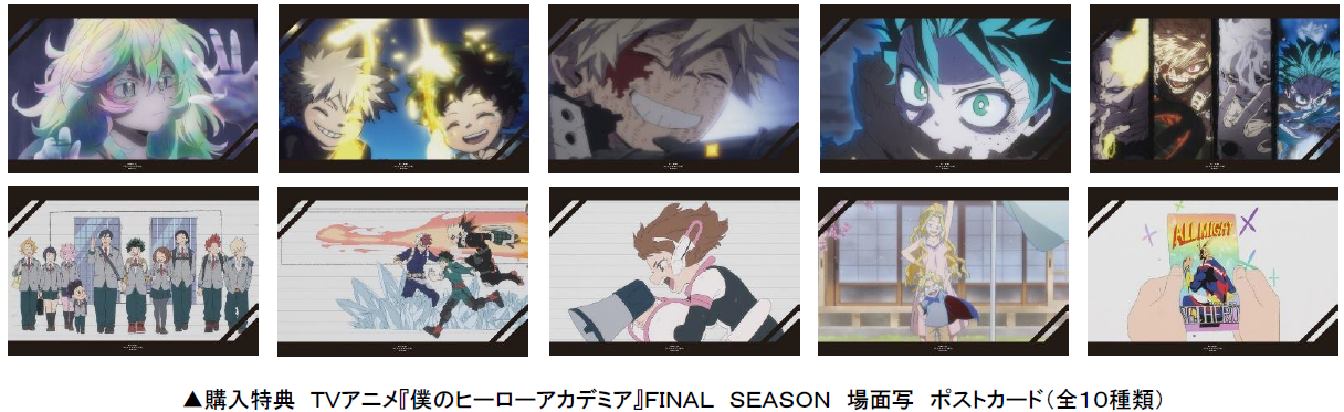 コラボホテル実施拠点となる「渋谷エクセルホテル東急」および飲食コラボ実施拠点となる「渋谷 東急フードショー」が入居する商業施設「渋谷マークシティ」では、テナントコラボキャンペーンを実施し、さらなる盛り上げを醸成します。 対象店舗にて税込1,000円以上お買い上げの方には、TVアニメ『僕のヒーローアカデミア』FINAL SEASONの場面写ポストカード(全10種)をランダムで1枚プレゼントします。また、館内に本企画オリジナル描き下ろしビジュアルのフォトスポットを設置します。 ※ポストカードがなくなり次第終了となります。