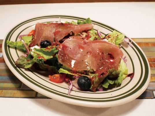 能登豚生ハムのミニサラダ 能登町ブルーベリーソース能登の大地が育んだ希少な能登豚の生ハムに、能登町産ブルーベリーの甘酸っぱいソースを添えたミニサラダ。