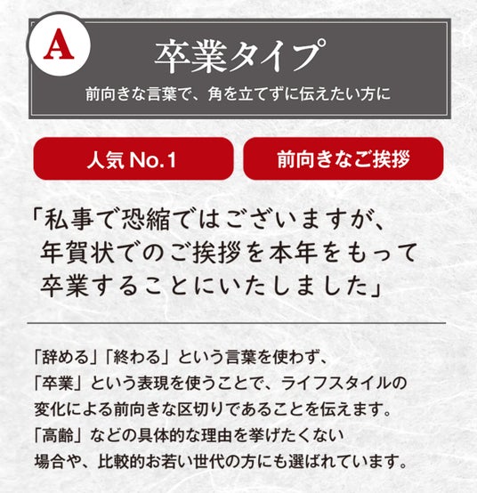 「そろそろ年賀状を終わりにしたい…」「でも、相手に失礼にならない伝え方がわからない…」デジタル時代における年賀状の悩みをポンと押すだけで解決。書体は読みやすく、相手への敬意が伝わる楷書体を採用