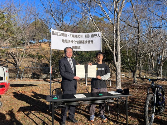 山梨県市川三郷町「市川公園MTBフィールド」にて調印式