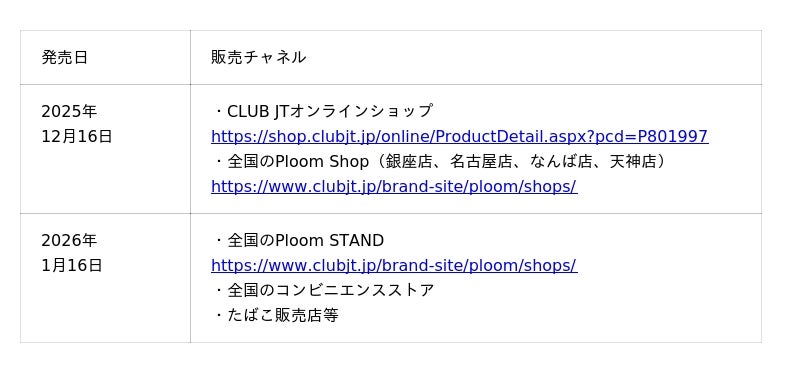 2025年12月16日より順次、CLUB JTオンラインショップ及び全国のPloom Shopにて発売します。また、2026年1月16日より順次、全国のコンビニエンスストア及びたばこ販売店等にて発売します。