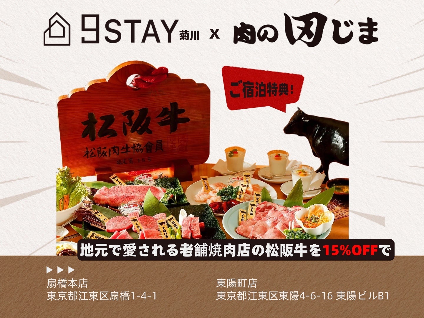9STAY菊川ホテルでは、近隣の地域住民から愛される老舗焼肉店「肉の田じま」と連携し、宿泊者限定の15%OFFクーポンを提供する共同キャンペーンを開始いたしました。「肉の田じま」は、松阪牛をはじめとした上質な黒毛和牛を提供する人気店として知られており、インバウンドのお客様に東京・江東区の“本物のローカル魅力”を体験していただく機会としても好評です。