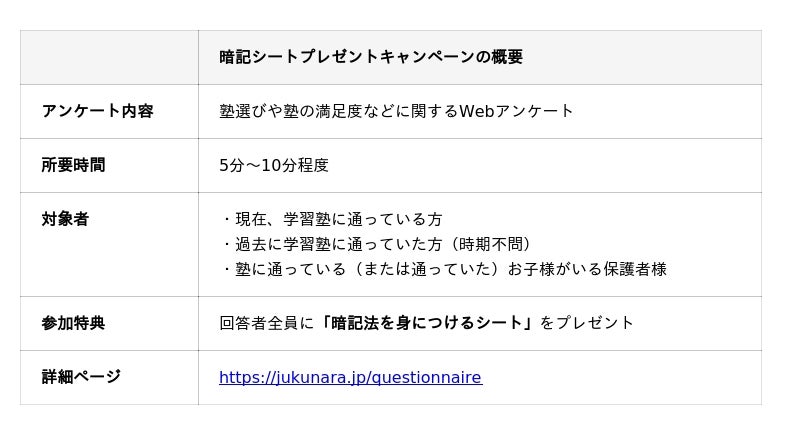 本キャンペーンでは、塾選びや通塾の満足度に関するアンケートにご回答いただいた方全員に、暗記科目の学習に役立つ「暗記法を身につけるシート(PDF版)」を無料でプレゼントいたします。