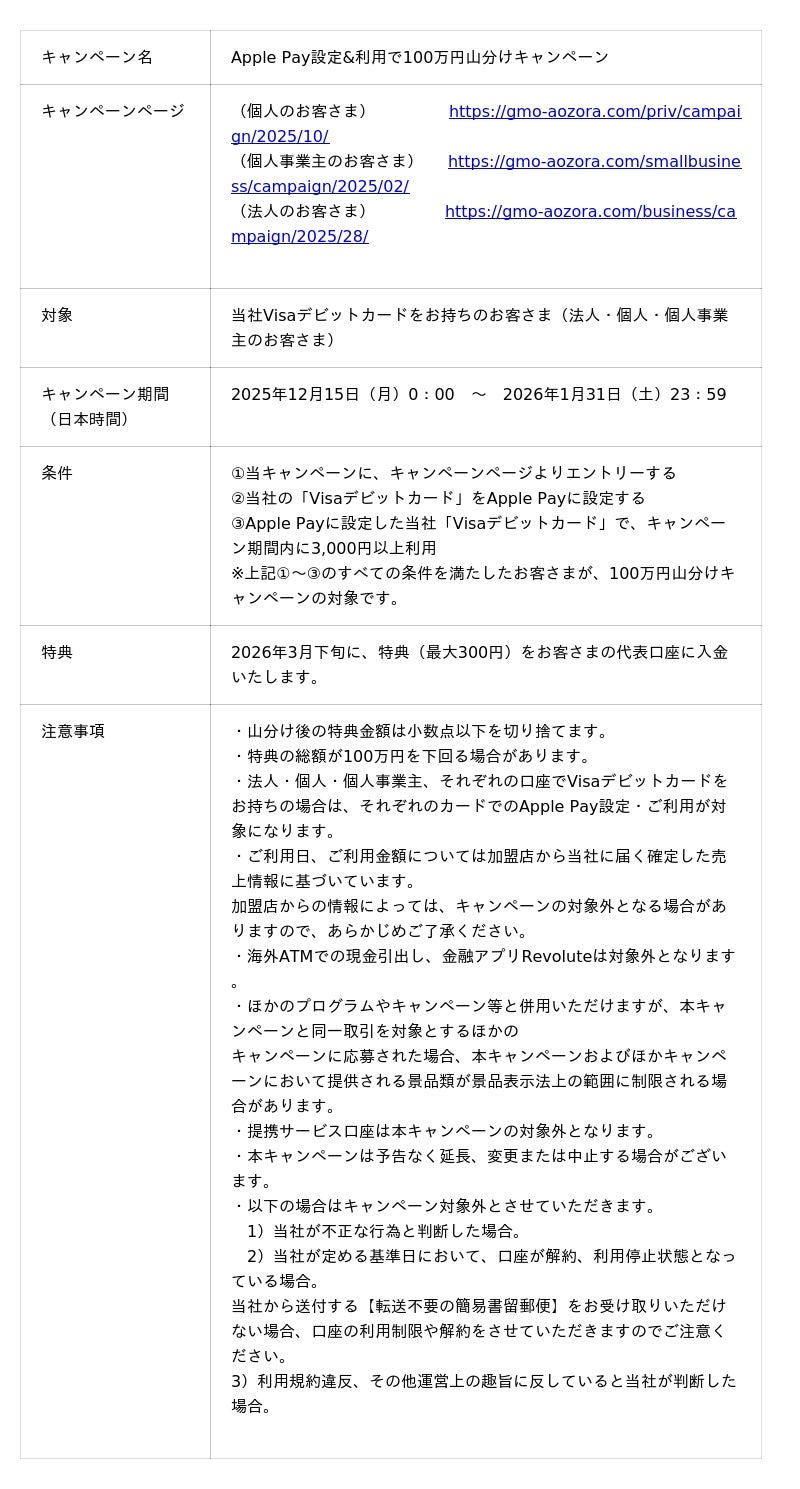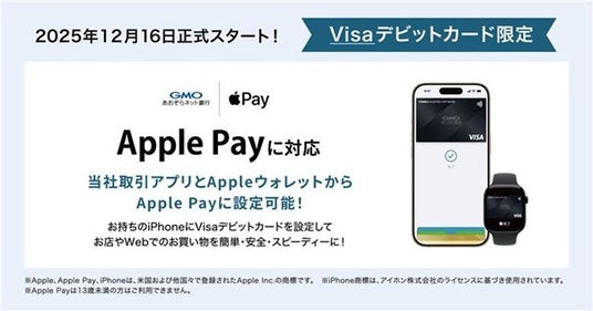 GMOあおぞらネット銀行株式会社(以下、当社)は、お客さまからのお声を受け、2025年12月16日(火)より、当社が発行する個人のお客さま向け「Visaデビットカード」と個人事業主・法人のお客さま向け「Visaビジネスデビットカード」(以下、「Visaデビットカード」)において、Apple Payへの対応を正式に開始します。