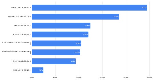 「めまい、立ちくらみ(約24.5%)」が圧倒的多数。一方で、「イライラや不安(約10.5%)」「肌荒れ・髪の脱毛(約10.3%)」についての認知は半数以下に留まりました。