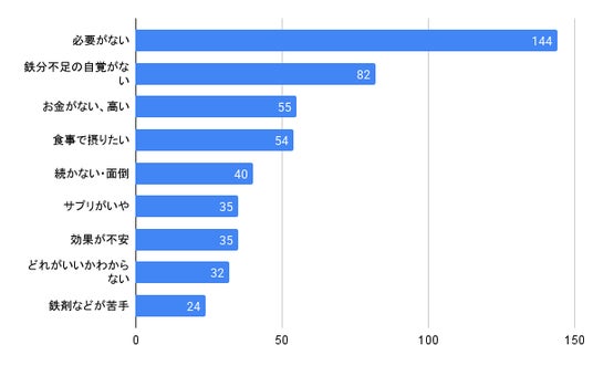 鉄分サプリを使用しない理由の第1位は「必要がない(144票)」、第2位は「鉄分不足の自覚がない(82票)」でした。