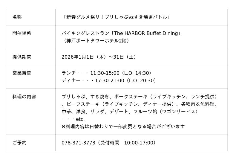 株式会社アベストコーポレーション(代表取締役:松山 みさお)が運営する神戸ポートタワーホテル(支配人:薩摩 利幸、兵庫県神戸市中央区)は、バイキングレストラン「The HARBOR Buffet Dining(ザ・ハーバー ビュッフェダイニング)」にて、2026年1月1日(木)から31日(土)まで、「新春グルメ祭り!ブリしゃぶvsすき焼きバトル」を開催いたします。