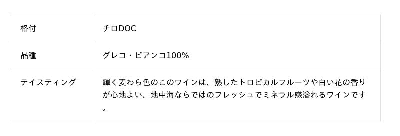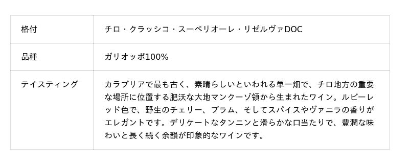 彼らはカラブリアの土着品種の復活に使命感をもち、ガリオッポ、グレコ・ビアンコ、カラブレーゼ品種を主に栽培。絶え間ない研究開発と革新的な技術の導入によって、チロの風土を感じさせるエレガントで高品質なワイン造りを続けています。