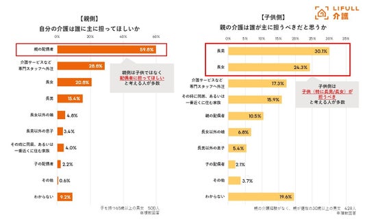 子供側は「長男」(30.1%)「長女」(24.3%)が担うべきと親子間で認識にギャップ。「配偶者」による介護を前提とした意識には老老介護による共倒れのリスクも