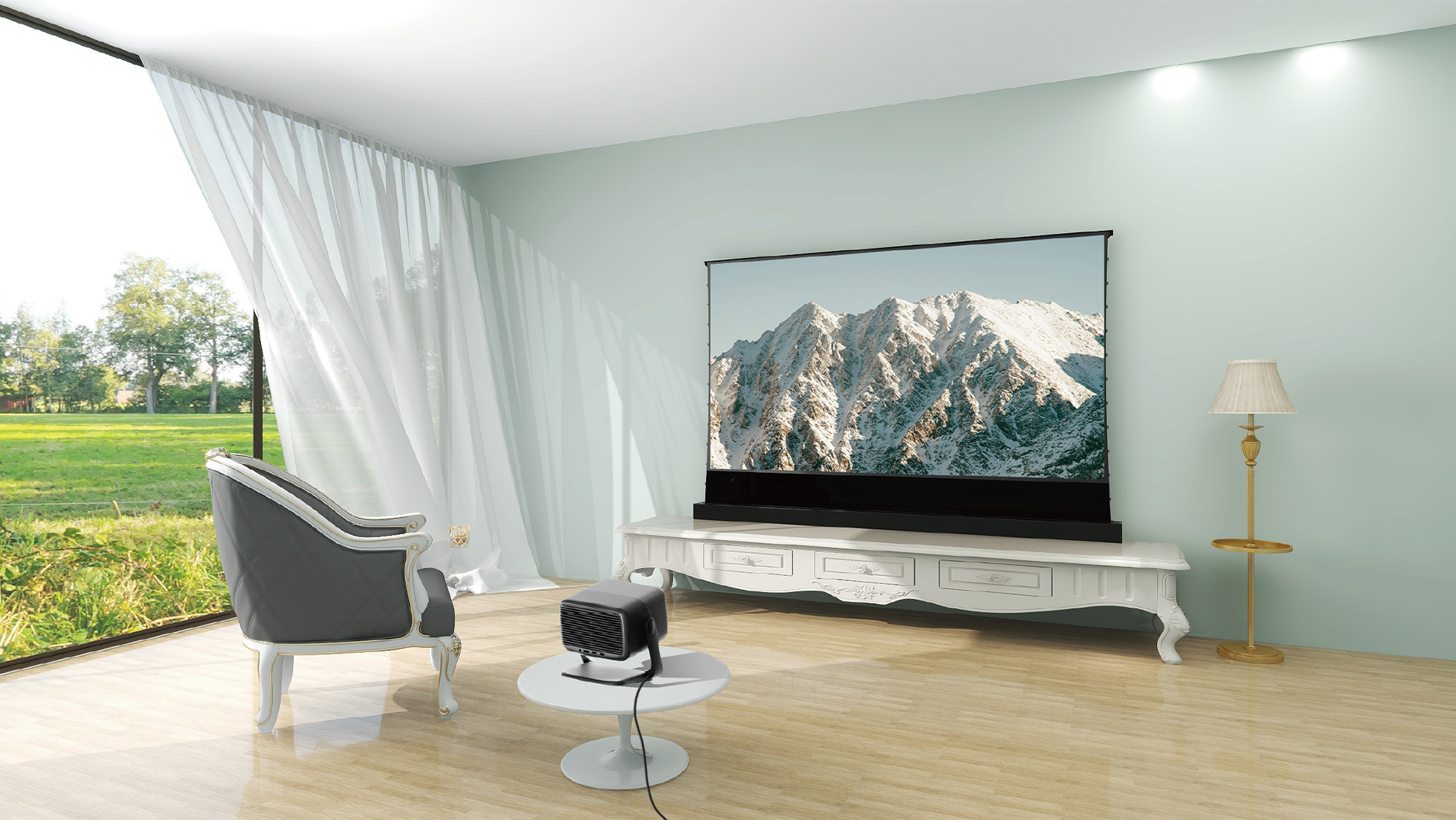 ジンバル一体型デザインにより、180インチまでの大画面投影もスムーズ。