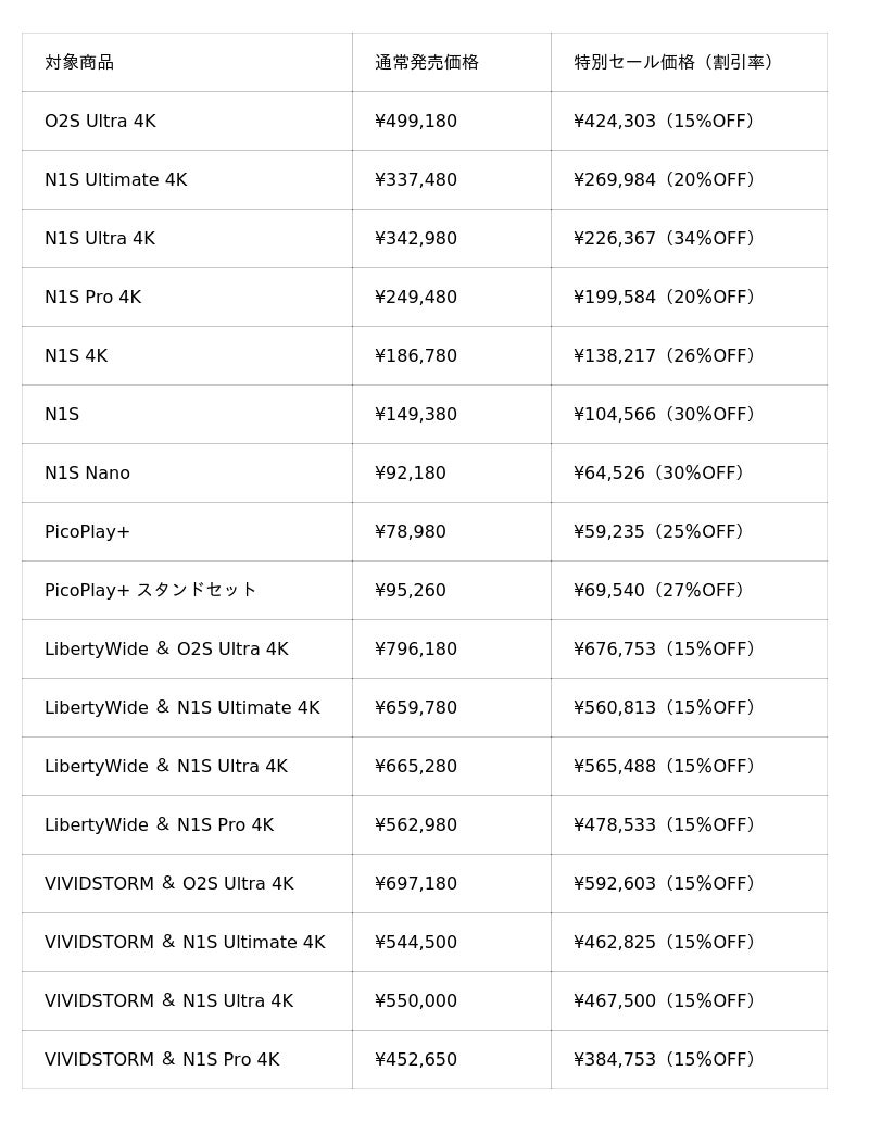 「O2S Ultra 4K」「N1S Ultimate 4K」「N1S Ultra 4K」「N1S Pro 4K」の4機種限定で、VIVIDSTORM製 電動スクリーンとのセットが15%OFFに