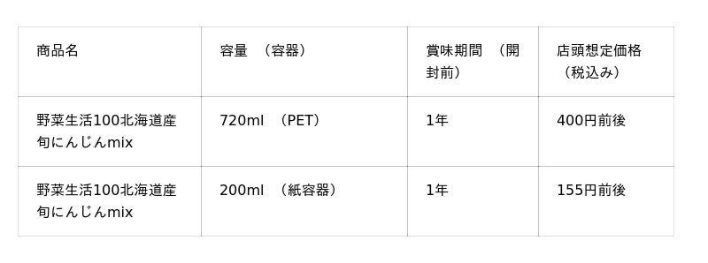 このたび発売する「野菜生活100北海道産旬にんじんmix」は、北海道の豊かな大地で真心を込めて育てられたにんじんを使用しています。ミルキーな甘さが特徴のにんじんにネーブルオレンジなどの果実を組み合わせることで、濃厚でやさしい甘みが楽しめる野菜・果実ミックスジュースです。1食分の野菜※2を使用し、β-カロテンやビタミンCを含んでいるため、手軽に野菜を摂取できます。
