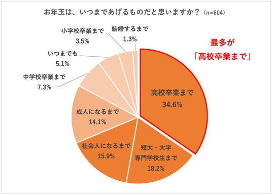 「お年玉は、いつまであげるものだと思うか」と質問すると、「高校卒業まで」が34.6%と最も多く、次いで「短大・大学・専門学校生まで」18.2%、「社会人になるまで」15.9%だった。