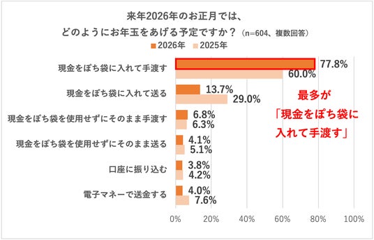 お年玉の渡し方は、現金をぽち袋に入れて手渡すスタイルが主流で、キャッシュレス決済が普及する今も、依然として現金派が多数を占めていることが明らかになりました。