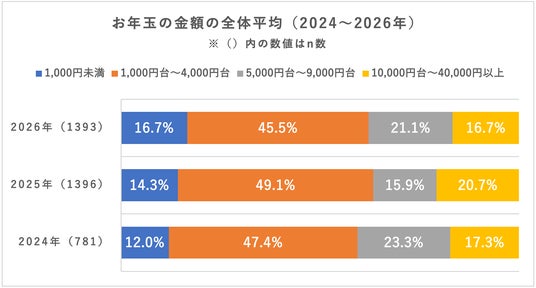 あげる金額の全体平均を昨年11月に実施した「2025年お年玉に関する実態調査」(※1)と比較すると、1,000円未満は16.7%と昨年より2.4%上昇、1,000円台~4,000円台が45.5%と3.6%低下、5,000円台~9,000円台は21.1%と5.2%上昇、10,000円台から40,000円以上が16.7%と4.0%低下。あげる金額は昨年より低下傾向にあることが明らかとなった。