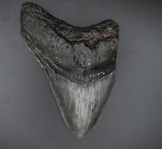 最大全長20m以上ともいわれています。このメガロドンの歯の化石は右側が欠けていますが、セレーション(ギザギザした形)も残っていて、しっかりと重たいことも特徴です。歯の厚みと滑らかな流線型が美しさを感じさせます。本物の化石です。