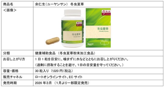ロート製薬株式会社(本社:大阪市、社長:瀬木 英俊)は、創業146年の歴史をもつ、東南アジア最大級※1のヘルスケアカンパニー「余仁生(ユーヤンサン)/ Eu Yan Sang(以下、ユーヤンサン)」と協業し、日本市場に向けて、冬虫夏草サプリメント『余仁生 冬虫夏草』を2026年3月より発売いたします。ストレスや疲労、睡眠不足を感じる人は増加しておりますが、本商品は「Vital Origin(生命力の源)を養う」という新しいセルフケア習慣を提案する第一弾商品です。