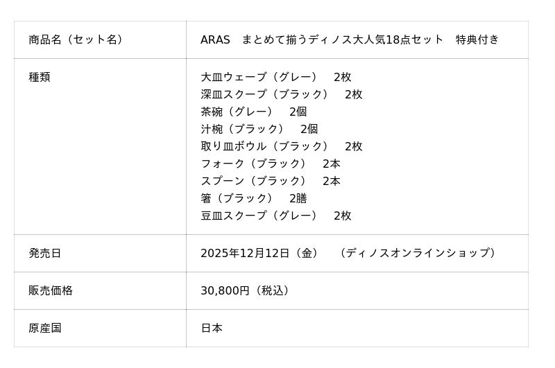 また、大皿ウェーブ、深皿スクープ、フォーク、スプーンに加え、茶碗や汁椀、取り皿ボウル、お箸、特典となる豆皿スクープ各2セットずつからなる「ARAS まとめて揃うディノス大人気18点セット 特典付き」は、特別価格30,800円(税込)で販売。洋食だけでなく和食も楽しんでいただけるセットとして、クリスマスやお正月といった季節のイベントでも使いやすい内容となっています。いずれのセットも、年明け1月12日(月)まで送料無料でお届けします。