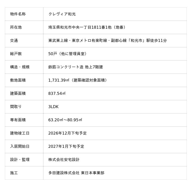 伊藤忠都市開発株式会社(本社:東京都港区、代表取締役社長:松 典男)は、埼玉県和光市中央一丁目で開発中の新築分譲マンション「クレヴィア和光」(総戸数50戸)の販売を開始し、2025年11月29日(土)より、第1期の契約を開始致しました。