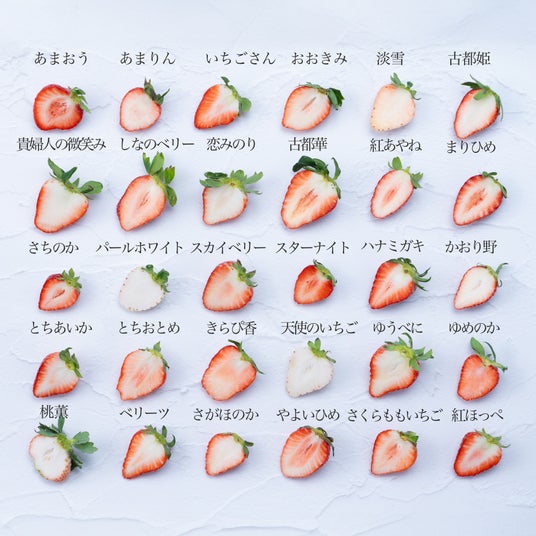 上段左から順に、・ゆめのか・古都華・貴婦人の微笑み・天使のいちご(白)・あまおう・さちのか・ベリーツ・恋みのり・淡雪(白)・古都姫・パールホワイト(白)・紅ほっぺ